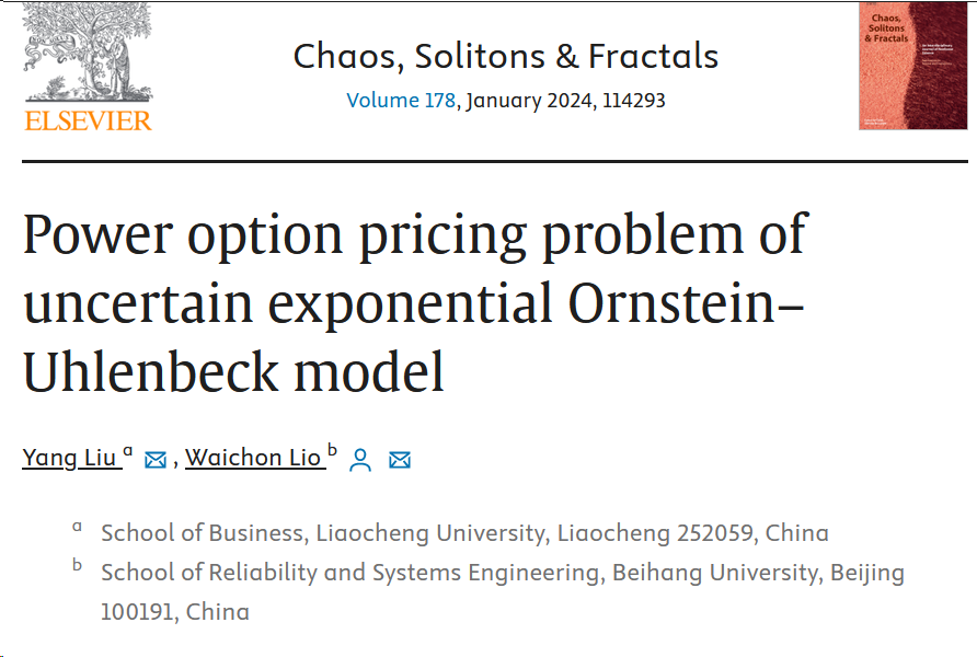 在最新的金融研究中,公司教师刘洋博士在期权定价领域取得了重大突破,相关研究成果“Power option pricing problem of uncertain exponential Ornstein–Uhlenbeck model”已在国际顶级期刊《Chaos, Solitions & Fractals》(混沌、孤立子与分形)发表。这项研究不仅深化了对幂期权的理解,同时拓展了金融衍生品定价的理论框架,为投资者提供了更为准确和可靠的定价模型。