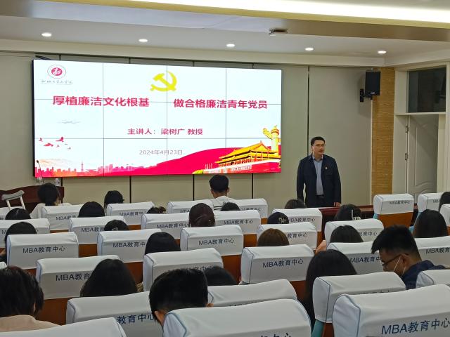 4月23日,必赢76net于东校区1#707举办入党积极分子专题党课培训会。公司党委纪检委员、副经理梁树广以《厚植廉洁文化根基 做合格廉洁青年党员》为题,对全体入党积极分子进行了培训。