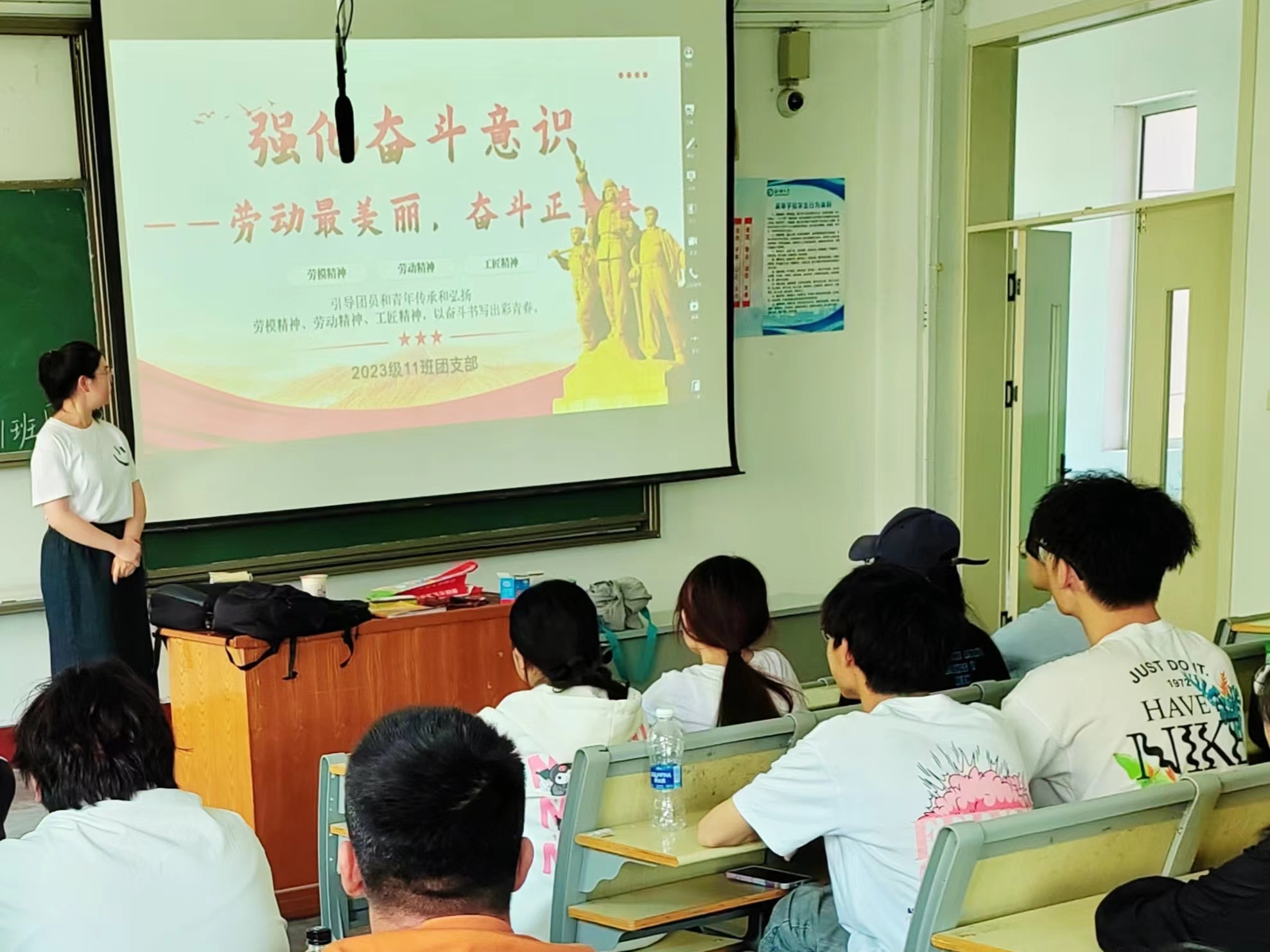 劳动身影绘就人生底色,奋斗精神铸就青春华章。员工们在负责人的带领下,有序投入到餐厅的卫生清洁工作中,认真仔细地擦拭着每一张餐桌,不放过任何一个角落,用实际行动践行劳动精神。在劳动的过程中,员工们展现出了极高的热情和责任感,他们互相帮助、协作配合,共同完成了清洁任务。通过亲身参与劳动,员工们深刻体会到了劳动的艰辛和不易,也感受到劳动带来的成就感和满足感。随后,两个班级围绕“劳动最美丽,奋斗正青春”召开主题团日班会。团支书首先带领同学们学习领会习近平总书记关于劳动教育的重要论述,呼吁同学们向中国青年五四奖章、全国“两优两红”等先进典型榜样学习,随后团支书向同学们分享邓稼先、袁隆平、王进喜三位杰出人物的奋斗历程及劳动精神,鼓励同学们树立正确的劳动观念和远大目标。最后,同学们纷纷表示要将知识内化于心,外化于行,提高自身文化素质,勇于投入到劳动实践中去。