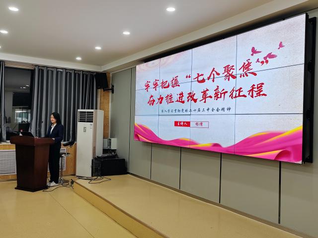 本次宣讲设置主会场和分会场,主会场现场宣讲,员工也可以通过分会场实时转播进行学习。会上,杨倩以党的二十届三中全会召开的重大意义和主要内容为切入点,深入浅出地剖析了“七个聚焦”的丰富内涵及其对推动改革新征程的关键作用,并引领商院学子透过“七个聚焦”准确把握全面深化改革的目标任务,领会“七个聚焦”对进一步全面深化改革的重大意义,鼓励员工围绕“七个聚焦”继续把全面深化改革推向前进。她指出,新时代中国青年应当在党的领导下,将“七个聚焦”融入个人成长发展,切实把思想和行动统一到习近平总书记重要讲话精神和全会决策部署上来,锚定进一步全面深化改革的总目标,以实际行动推动全面深化改革向纵深发展,努力创造经得起历史、实践和人民检验的改革成果。