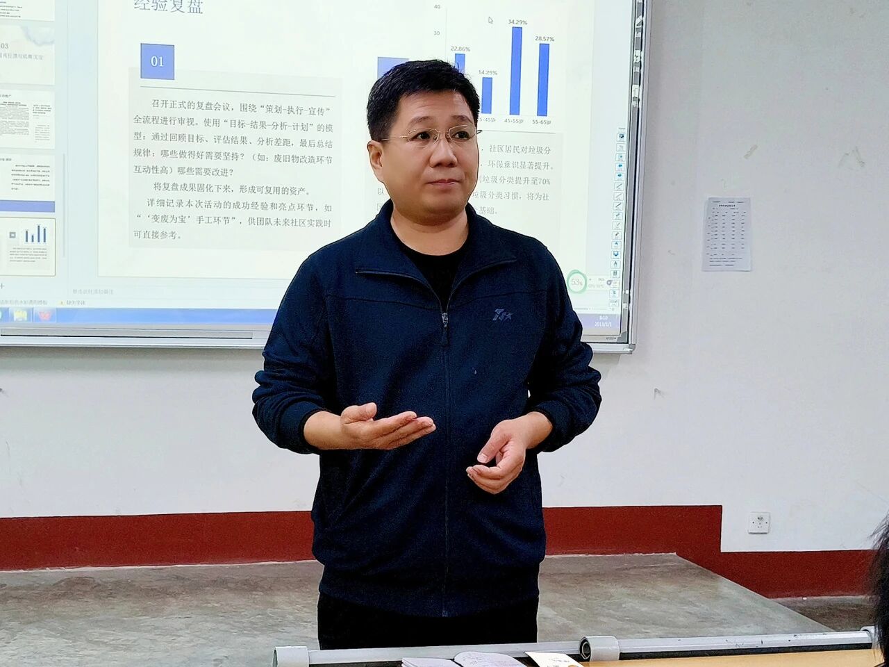 刘玉华就新学期社区实践工作作出整体部署。他指出,以往实践中存在班级动员不充分、项目持续性不强等问题,建议各班构建“以班团为主、班委为辅”的沟通机制,强化组织动员,提升员工参与度和积极性。同时,他鼓励同学们结合专业特色,设计具有深度与持续性的实践项目,强调社区实践不仅是完成任务,更是个人成长与社会责任的双重历练,并进一步呼吁同学们在服务中感知社区真实需求,在实践中锤炼担当精神,开展有温度、有实效的志愿服务。